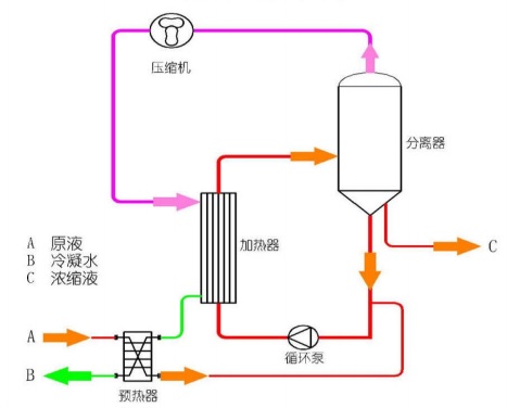 機械式蒸汽再壓縮MVR蒸發器利用蒸發器中產生的二次蒸汽,經壓縮機壓縮,壓力、溫度升高,熱焓增加,然后送到蒸發器的加熱室當作加熱蒸汽使用,使料液維持沸騰狀態,而加熱蒸汽本身則冷凝成水。這樣,原來要廢棄的蒸汽就得到了充分的利用,回收了潛熱,又提高了熱效率,生蒸汽的經濟性相當于多效蒸發的30效,減少了對外部加熱及冷卻資源的需求,降低能耗,減少污染。