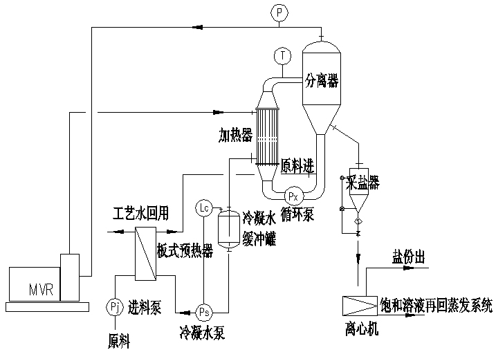1、對于在蒸發過程中無結晶時,系統比較簡單,系統由預熱器、蒸發器(可以采用升膜式或降膜式)、分離器、MVR壓縮機和接收罐組成(如下圖)再配出料泵及控制部分,組成一套完整的MVR蒸發器系統;蒸發可以是常壓或負壓,根據物料的特性而定,負壓蒸發時要考慮出料泵的汽蝕余量克服系統的真空。